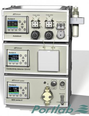 Решение на основе базовой модели одноканального ионного хроматографа Джетхром с системой автоматической промывки жидкостного тракта и анионным подавителем фоновой электропроводности для последовательного определения неорганических катионов и анионов (литий, натрий, аммоний, калий , магний, кальций, стронций, фториды, хлориды, нитраты, нитриты, сульфаты, фосфаты, хроматы, ванадаты и др.), анализа низших карбоновых кислот и органических ионов в водных растворах, водах различного происхождения (природных, сточных, питьевых, в т.ч. бутилированных), в окрашенных технологических растворах, а так же в водных экстрактах, пищевых продуктов, почвы, газов.
